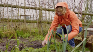 On the farm, Kate’s creating a dedicated home for 250,000 new arrivals: a muddy corner of a field is transformed into a beautiful wild flower meadow, with a beehive shelter made with wood specially milled by Farmer Tim.